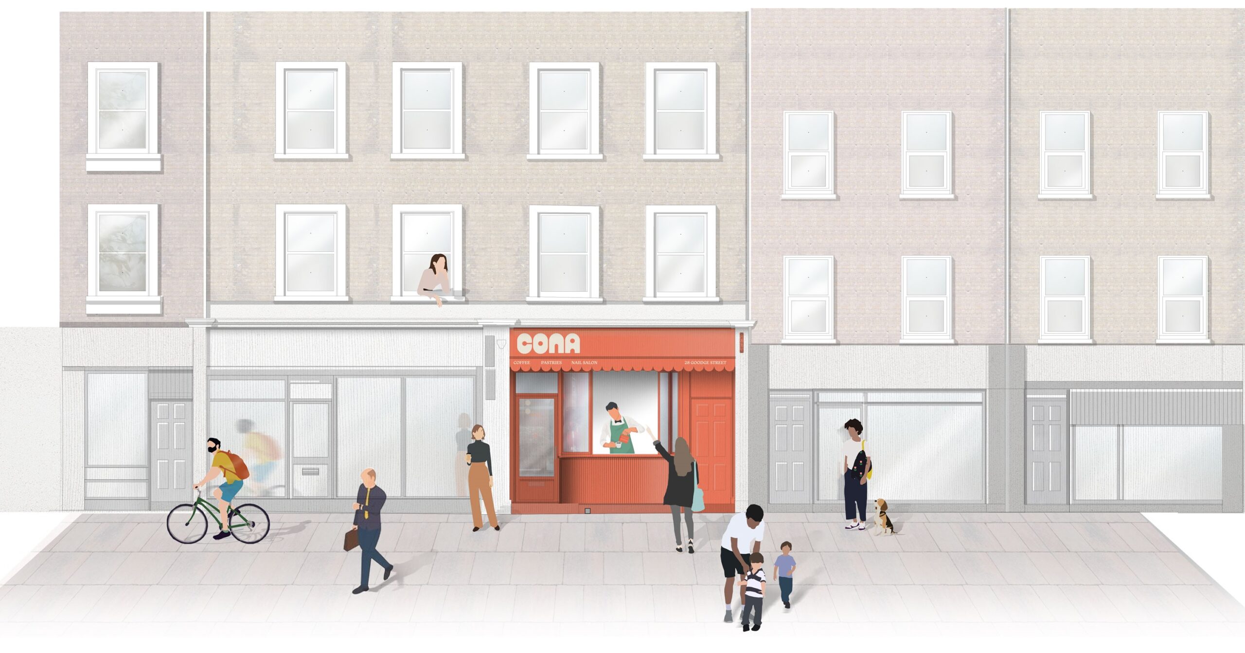 Cona combines a highstreet coffee shop and nail salon in the heart of Goodge Street, London, creating a unique, sensory-rich environment. Its coral-fluted façade and undulating awning draw attention from the street, while an open servery window and flowing interior guide customers through the space. Playful curves, layered materials, and a vibrant colour palette create a joyful, immersive experience, blending café culture with salon services to deliver a one-of-a-kind destination for locals and visitors alike.