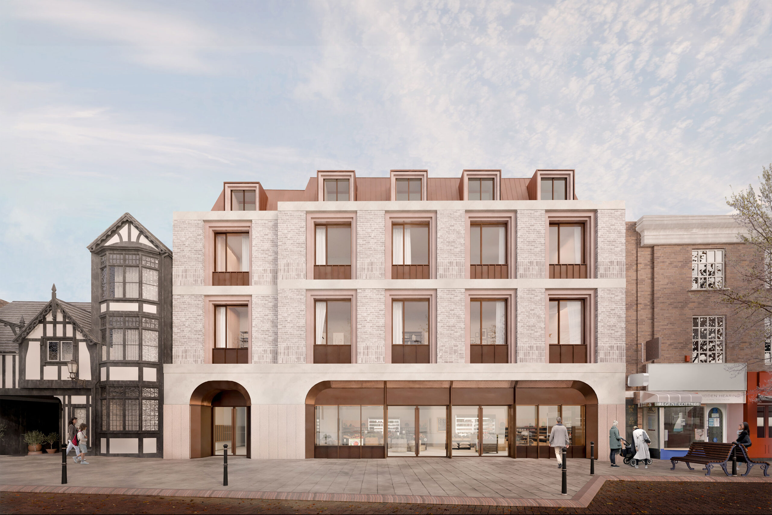 Replacing the pastiche 1960s Woolworths shopfront, the high street facade features a modern design that is sympathetic to the historic context. It includes a glazed shopfront reminiscent of historic cabinet windows and an arched entrance to the residential area, echoing the prominent carriageways along the street. The residential facade above culminates in a set-back mansard roof with dormer windows, maintaining the strong horizontal language and scale of the high street.