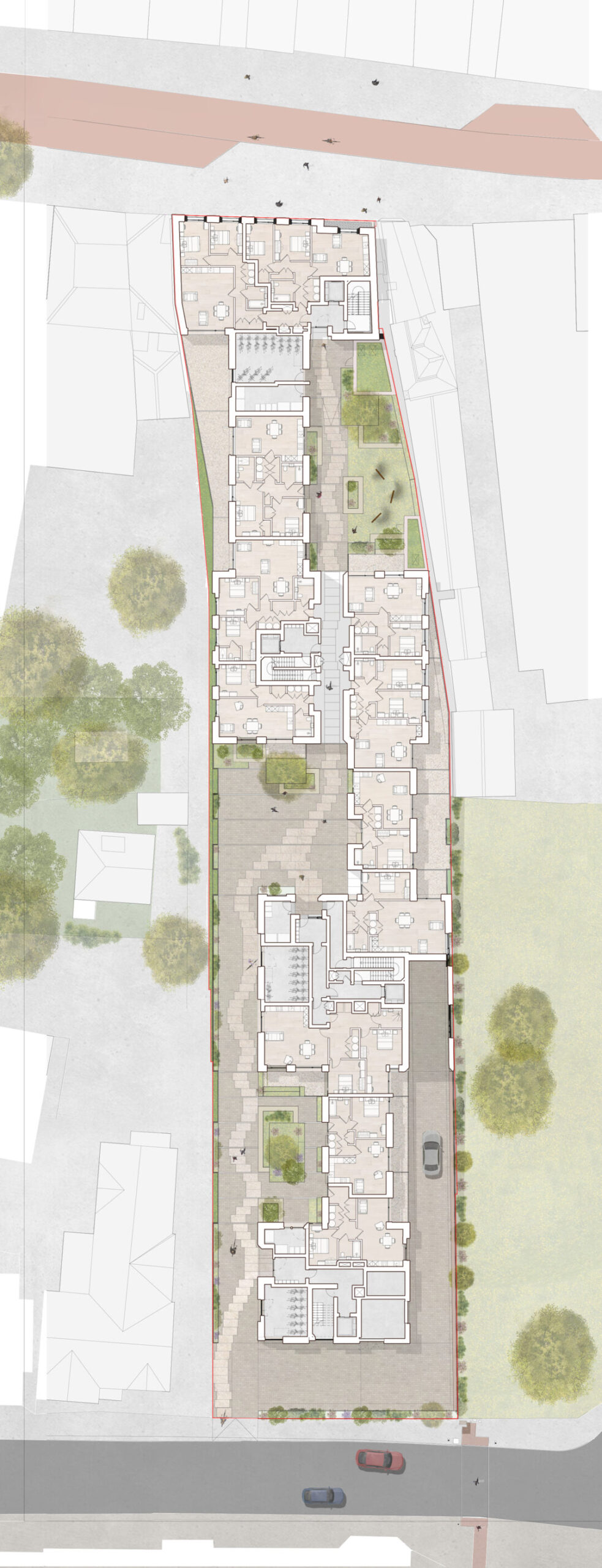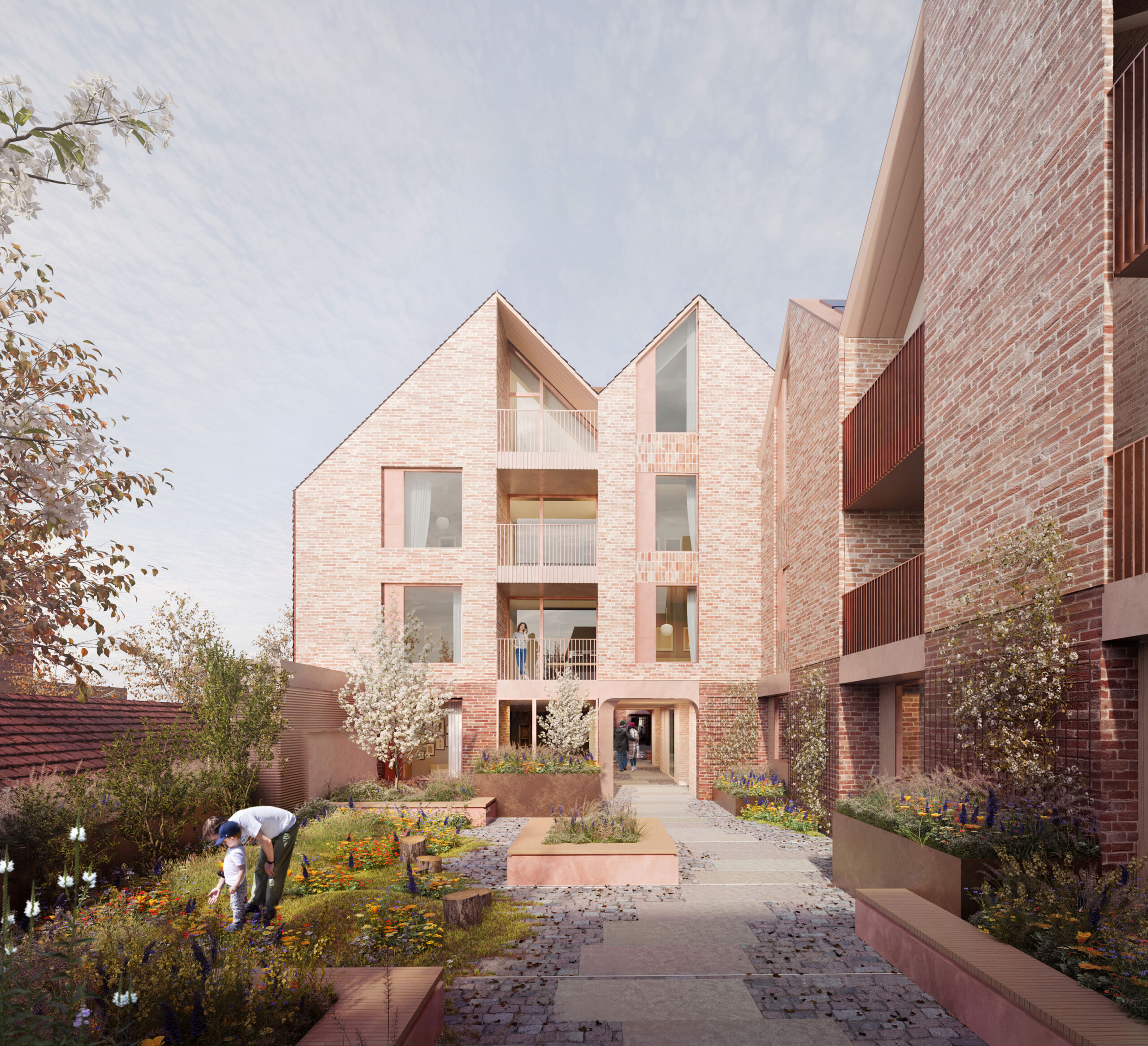 Our goal was to reimagine this complex site to create a new sense of urbanism in the town centre, centred around the needs of residents and users. At the heart of the design is a series of courtyards, surrounded by homes and pedestrian gardens